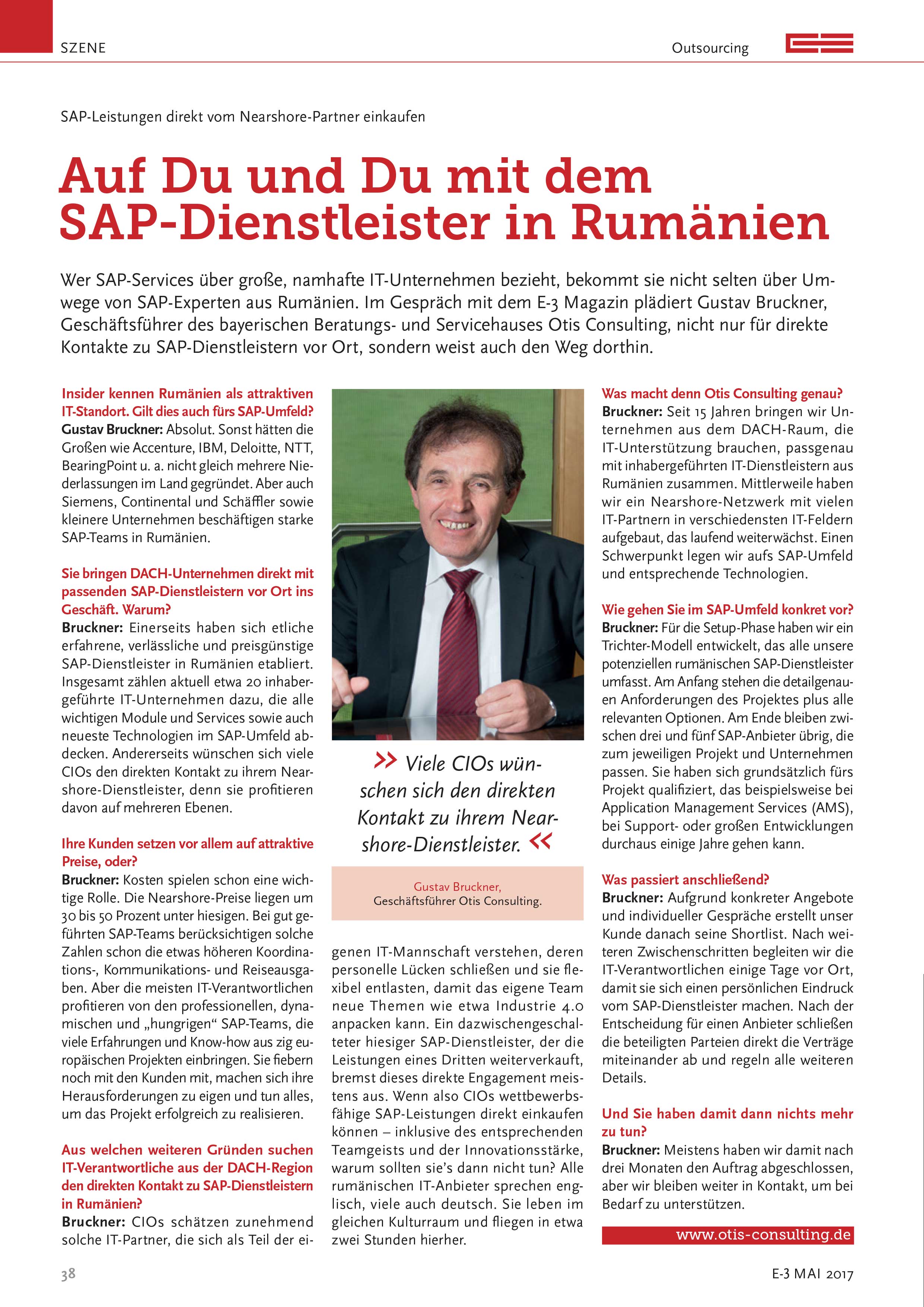 Im Interview erläutert Gustav Bruckner, Geschäftsführer von Otis Consulting, die Vorteile eines direkten Kontakts zu Nearshore SAP-Dienstleistern in Rumänien und zeigt, welche Wege dorthin führen. Die Großen wie Accenture, IBM, Deloitte haben gleich mehrere Niederlassungen im Land gegründet, aber auch Siemens, Continental und Schäffler sowie kleinere Unternehmen beschäftigen starke SAP-Teams in Rumänien.